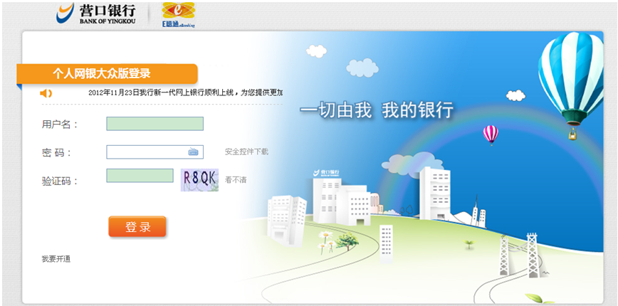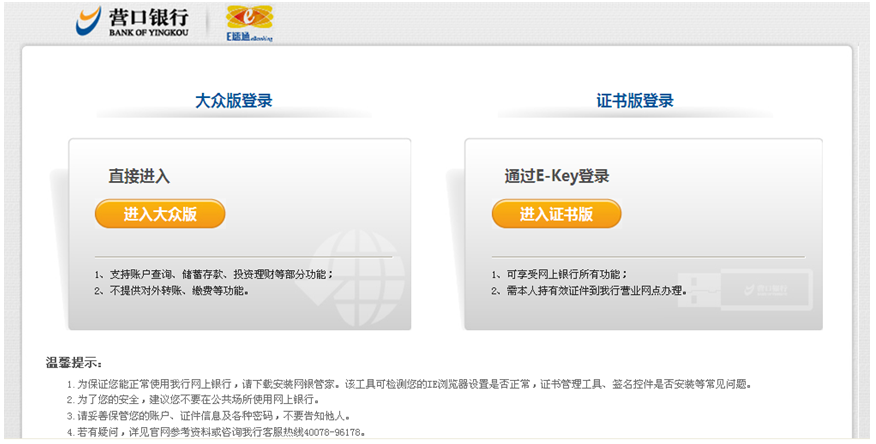 登錄營(yíng)口銀行官方網(wǎng)站(www.projectuss.com),選擇個(gè)人網(wǎng)上銀行,點(diǎn)擊“進(jìn)入大眾版”![]() 點(diǎn)擊“進(jìn)入大眾版”后出現(xiàn)登錄頁(yè)面:![]() ![]() |