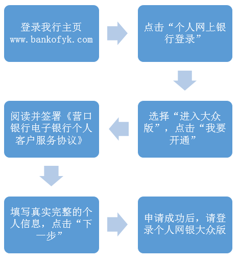 持有營(yíng)口銀行卡或存折的客戶(hù),可以通過(guò)任意一臺(tái)連接Internet的電腦登錄www.projectuss.com自助注冊(cè)營(yíng)口銀行個(gè)人網(wǎng)上銀行大眾版,具體操作流程如下: ![]() |