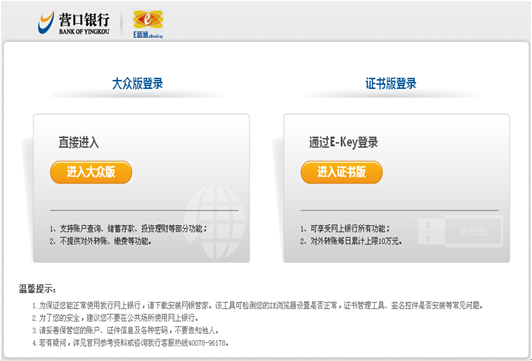 營口銀行個人網上銀行專業版提供賬戶管理、轉賬匯款、自助繳費、儲蓄理財、投資理財、自助簽約、客戶服務等功能。您可以選擇相應的菜單后點擊需要操作的子菜單進行操作。 |